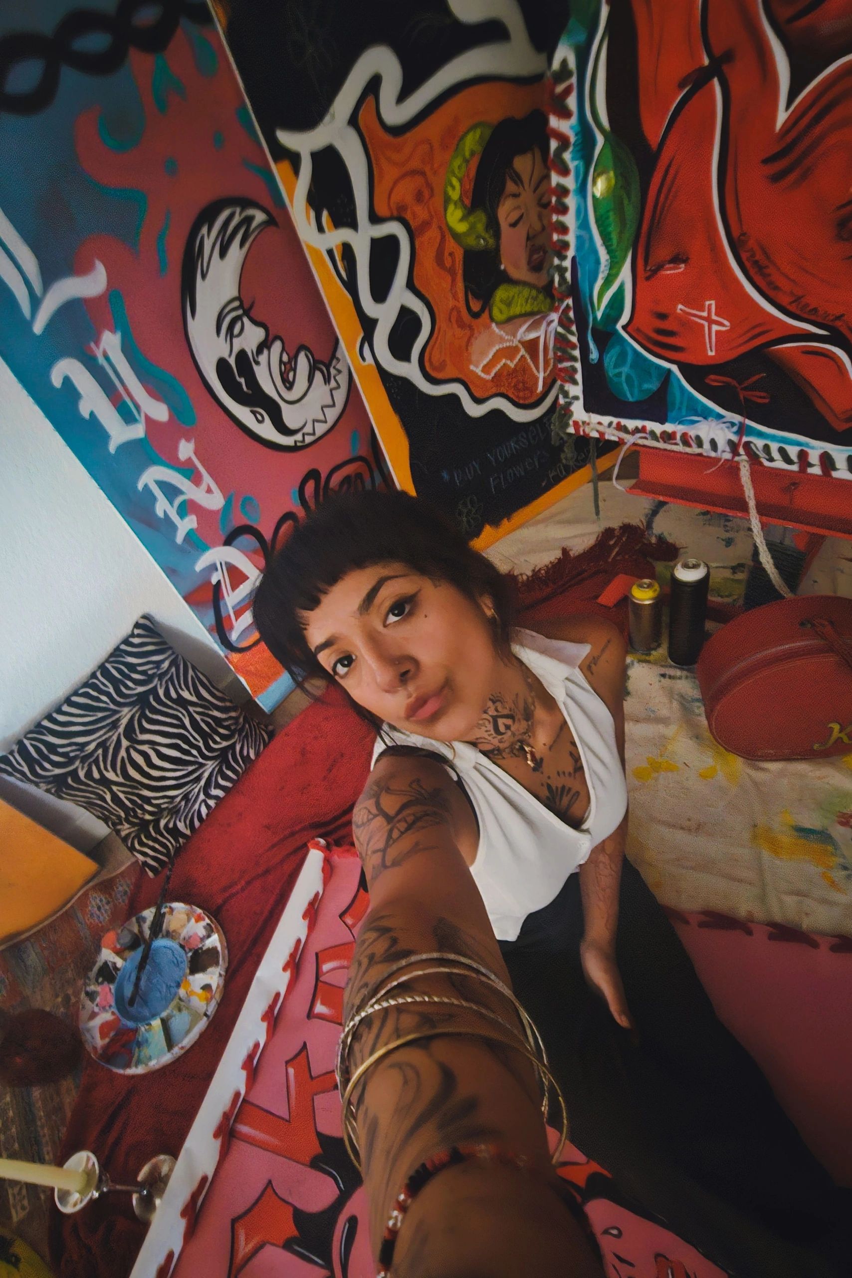 Artwork is all created with acrylic, spray paint, and paint markers. Mostly on canvas, wood, or street signs